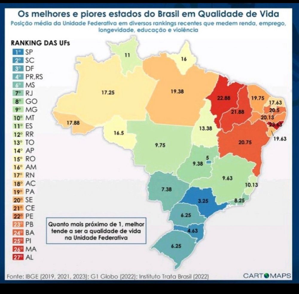 Um ranking de qualidade de vida divulgado pelo G1 (ver mapa abaixo), com base em dados do IBGE nos últimos anos, mostra que as últimas 8 posições são ocupadas por Estados nordestinos. Um desastre, uma prova do aprofundamento das desigualdades e um atestado de que as lideranças da região não estão compreendendo o problema da região.