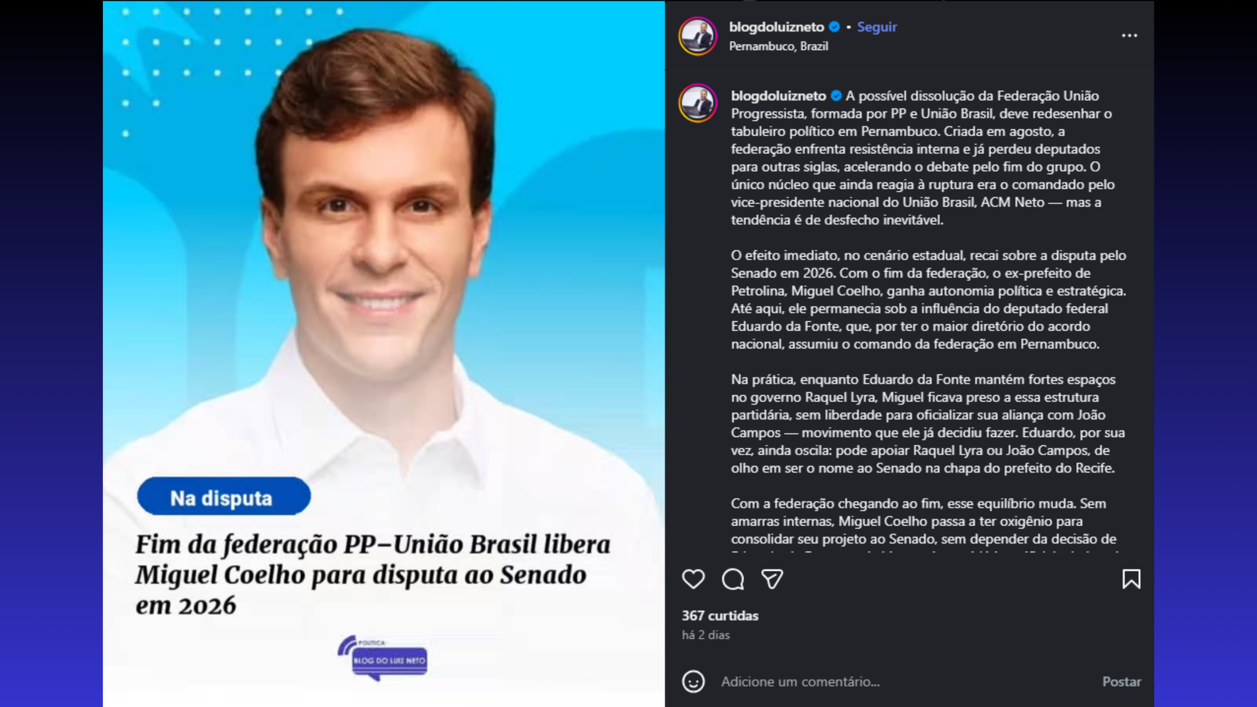 Neste ponto, entra a dimensão mais ampla das informações que circulam em Pernambuco: a Federação União Progressista estaria se dissolvendo. O blog do Luiz Neto, por exemplo, publicou há dois dias que o único núcleo que ainda resiste à dissolução seria o do ex-prefeito ACM Neto (União), da Bahia.