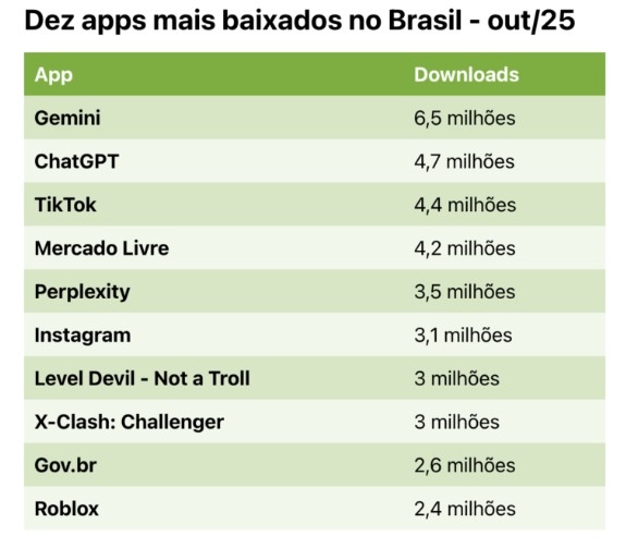 Três aplicativos de inteligência artificial generativa ficaram entre os cinco mais baixados no Brasil em outubro. O Gemini, do Google, liderou o ranking com 6,5 milhões de downloads no conjunto da App Store e Google Play. O ChatGPT, da OpenAI, ocupou a segunda posição com 4,7 milhões de instalações, número próximo ao registrado no mês anterior.
