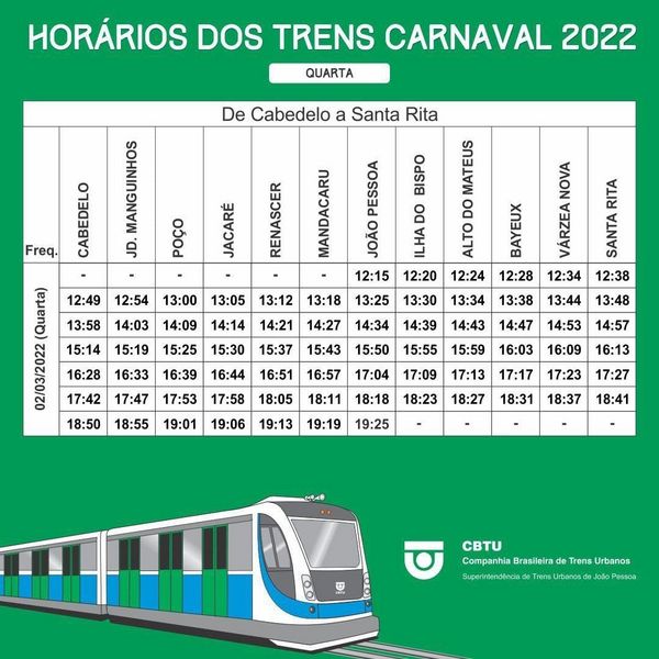 A Companhia Brasileira de Trens Urbanos (CBTU) de João Pessoa comunicou, na tarde desta sexta-feira (25), que os Veículos Leves sobre Trilhos (VLTs) irão funcionar em horário especial nos dias 28 de fevereiro, 1º de março e 2 de março, data em que se festeja o carnaval.