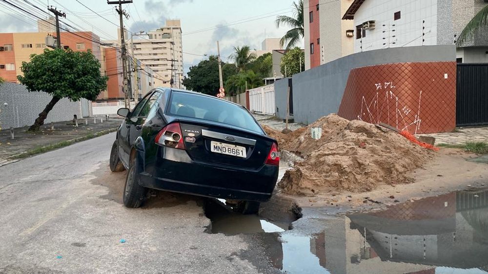 Um carro ficou danificado ao cair em um buraco, na noite dessa terça-feira (12), no bairro Jardim Cidade Universitária, em João Pessoa. A abertura do asfalto foi provocada por uma obra, mas no local não havia sinalização no local.
