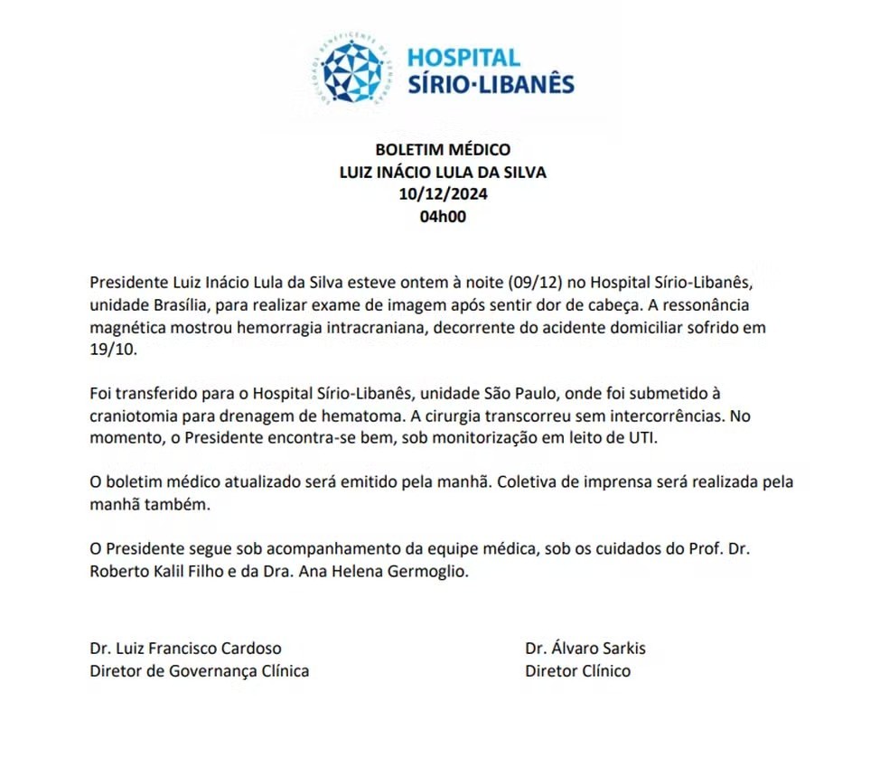 O presidente Luiz Inácio Lula da Silva foi submetido a uma cirurgia de emergência na madrugada desta terça-feira (10), no Hospital Sírio-Libanês, em São Paulo, para tratar um hematoma intracraniano. O procedimento foi necessário após ele sentir dores de cabeça intensas na noite anterior, ainda em Brasília, onde realizou exames que detectaram a hemorragia intracraniana.