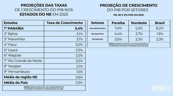 A Paraíba deve liderar o crescimento do Produto Interno Bruto (PIB) entre os estados do Nordeste em 2025, segundo a Resenha Regional de Assessoramento Econômico do Banco do Brasil, divulgada em 30 de maio. A projeção aponta expansão de 3,4% na atividade econômica do Estado neste ano, acima da média do Nordeste (2,6%) e do Brasil (2,5%).