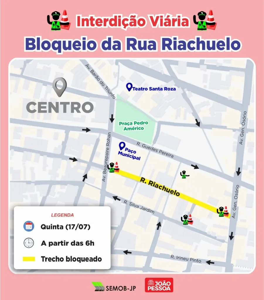 A Rua Riachuelo, no Centro de João Pessoa, será totalmente interditada nesta quinta-feira (17), das 7h às 17h. A interdição foi solicitada para permitir a retirada de entulhos da obra de requalificação de um prédio histórico próximo ao Paço Municipal.