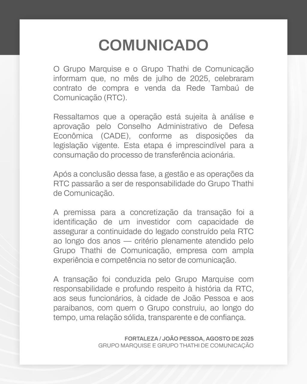 O Grupo Marquise e o Grupo Thathi de Comunicação informaram nesta segunda-feira (04) que, no mês de julho de 2025, celebraram contrato de compra e venda da Rede Tambaú de Comunicação (RTC).