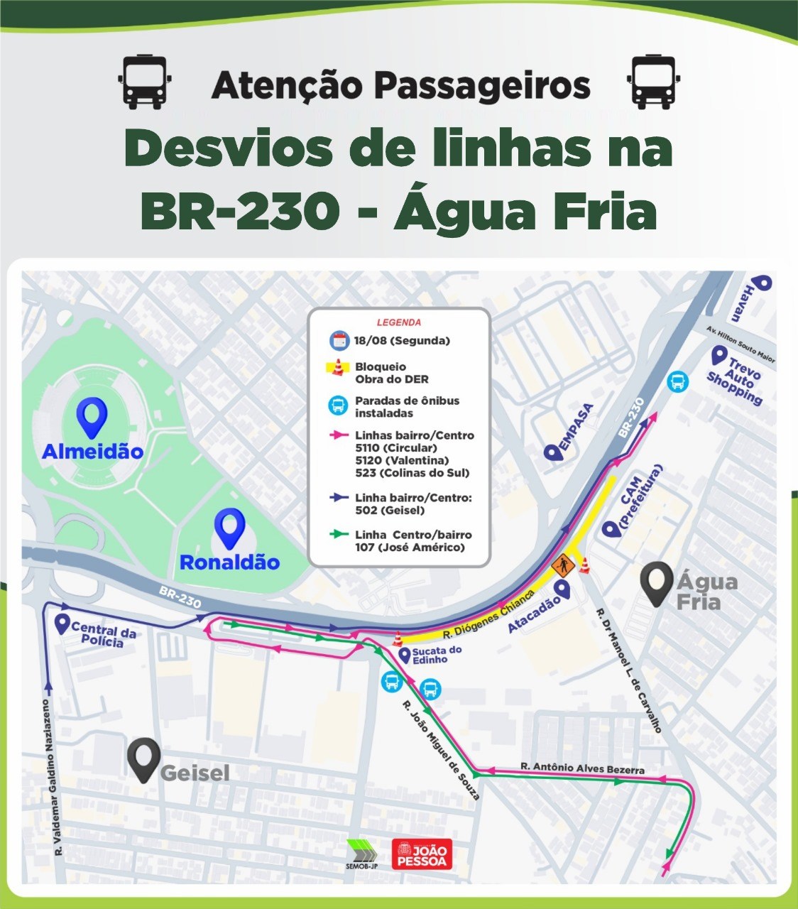 A linha 502, que atende ao bairro do Geisel, continuará utilizando o trajeto alternativo já adotado em ocasiões anteriores. O itinerário prevê passagem pela Rua Manoel Rufino da Silva, acesso à BR-230 e retorno pela Avenida Diógenes Chianca, de onde segue até recompor o percurso original. Já a linha 107, que atende ao José Américo, terá alteração apenas no sentido Centro-bairro. Os ônibus farão o desvio a partir da Rua João Miguel de Sousa, entrando na Rua Antônio Alves Bezerra e depois retomando o trajeto normal pela Rua Manoel Lopes de Carvalho.
