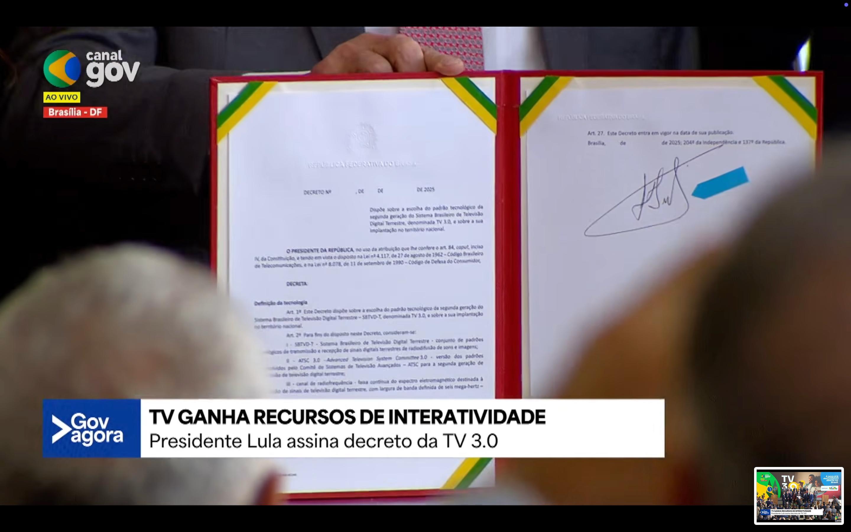 O presidente Luiz Inácio Lula da Silva assinou nesta quarta-feira (27) no Palácio do Planalto o decreto que regulamenta a TV 3.0, a nova geração da televisão aberta e gratuita no Brasil. A cerimônia contou com a presença do ministro das Comunicações, Frederico Siqueira, e de representantes do setor.