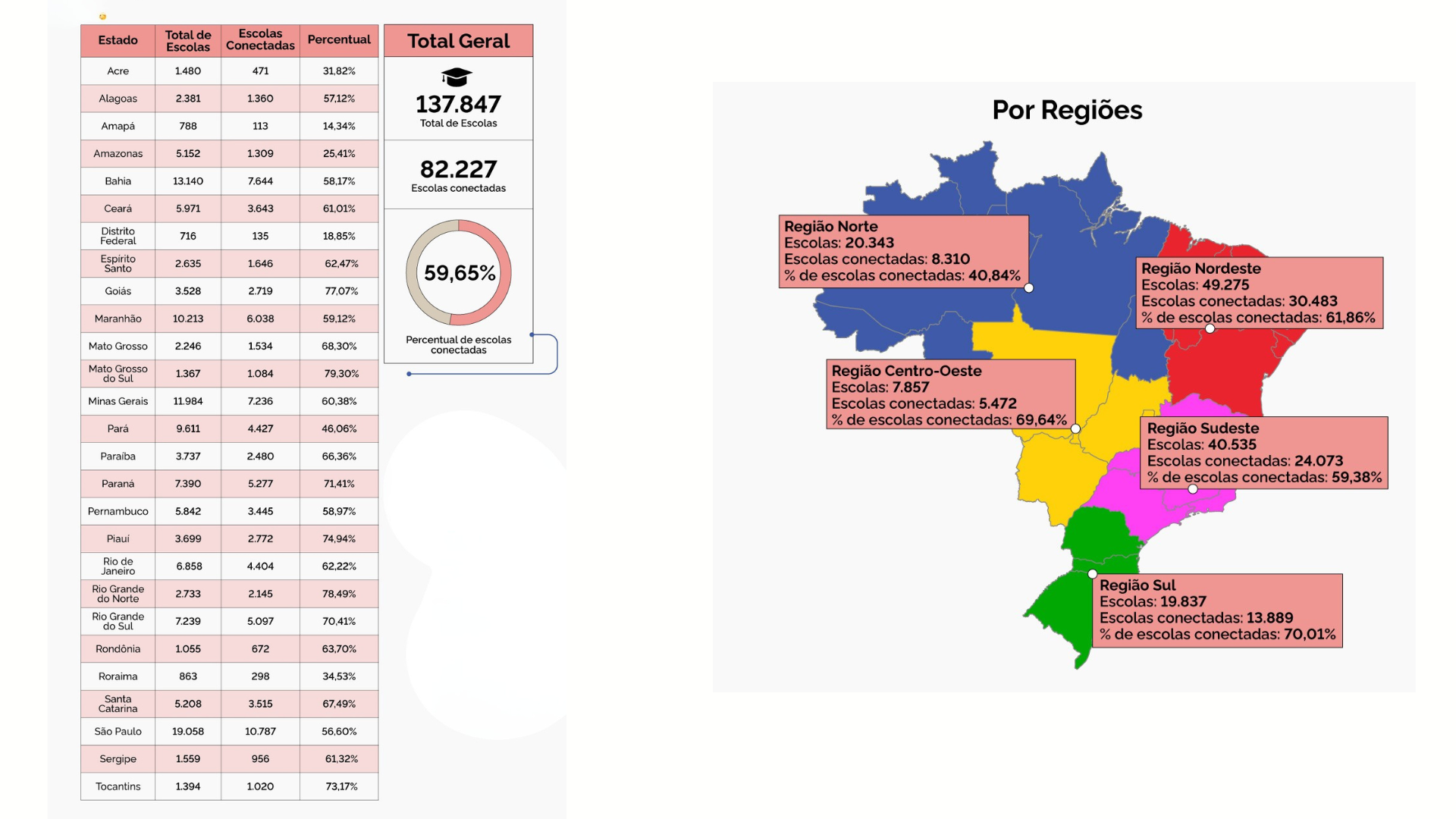 Entre as regiões do país, o Sul tem o maior percentual de escolas conectadas (70%), seguido pelo Centro-Oeste (69,64%), Nordeste (61,86%), Sudeste (59,38%) e Norte (40,84%). Entre os estados, Mato Grosso do Sul lidera com 79,3% de cobertura, seguido por Rio Grande do Norte (78,49%) e Goiás (77,07%).