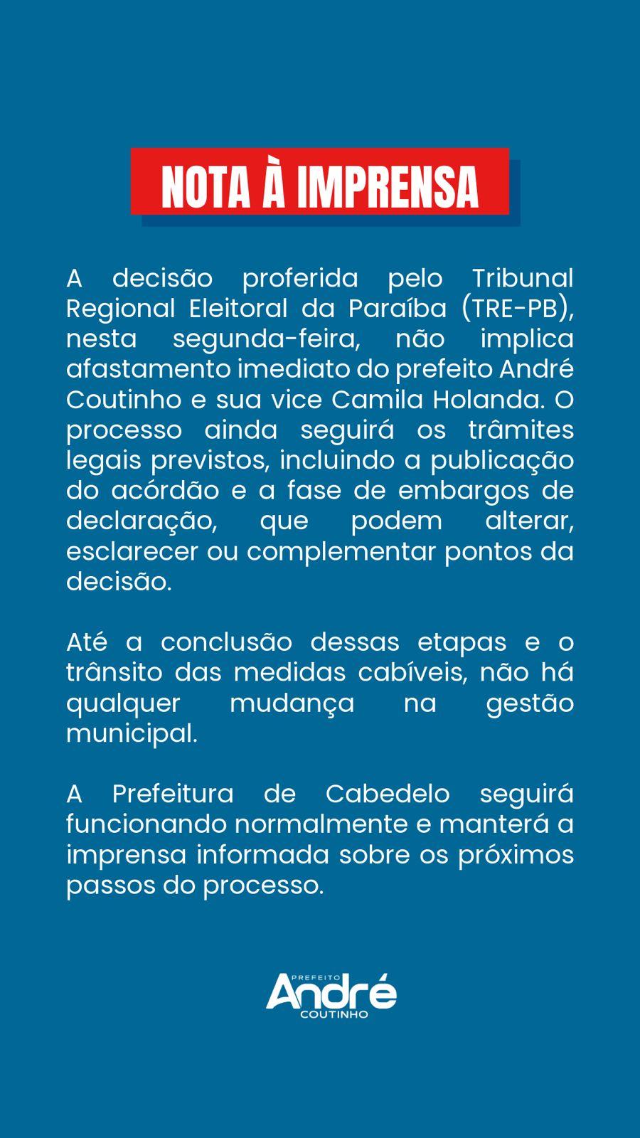 As cassações dos mandatos de André Coutinho, Camila Holanda e Márcio Alexandre, mantidas pelo Tribunal Regional Eleitoral da Paraíba nesta segunda-feira (17), não produzem afastamento imediato, segundo informação divulgada pela gestão de Cabedelo. O comunicado explica que o processo ainda passará por etapas obrigatórias, como publicação do acórdão e apresentação de embargos de declaração, o que impede qualquer mudança imediata no comando municipal.