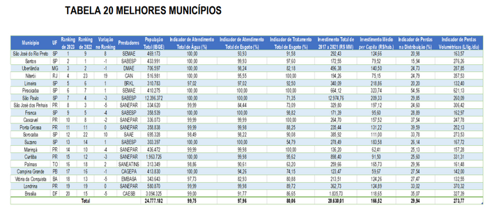 Dos 20 melhores municípios do Ranking de 2023, oito são do estado de São Paulo, seis do Paraná, um de Minas Gerais, um do Rio de Janeiro, um do Tocantins, um da Paraíba, um da Bahia e de Brasília, no Distrito Federal. Entre os melhores casos, houve uma surpresa positiva: pela primeira vez na história do Ranking do Saneamento, um município obteve nota máxima em todas as